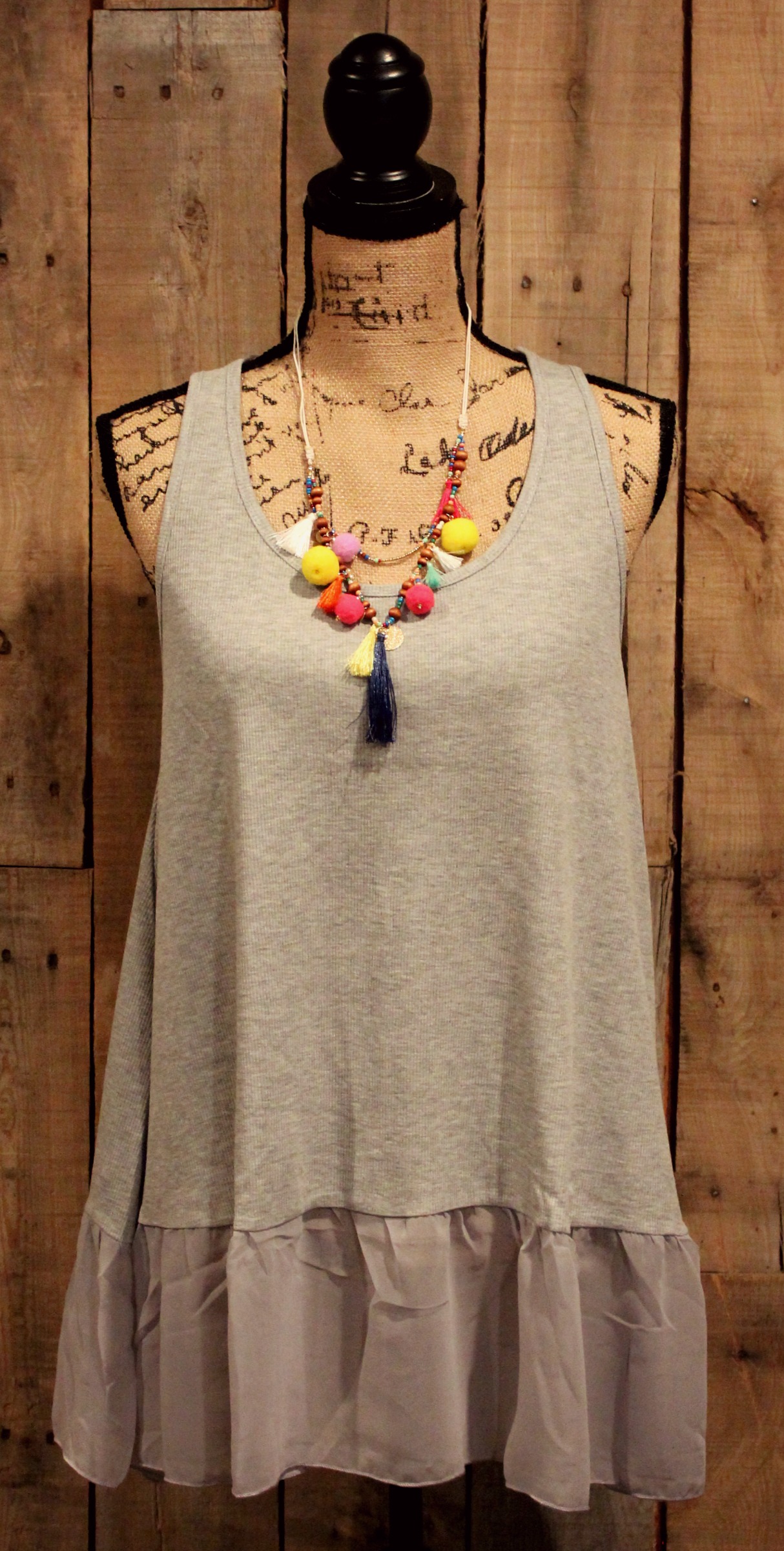 This heather gray ribbed and ruffled tank top is a fun addition to any summer wardrobe. Dress it up with bright jewelry!